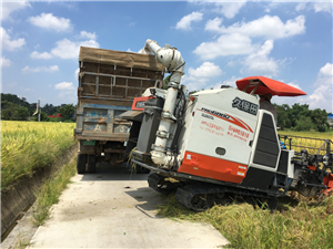 在兩輛收割機緊張的工作下,一個多小時貨車就已裝滿。